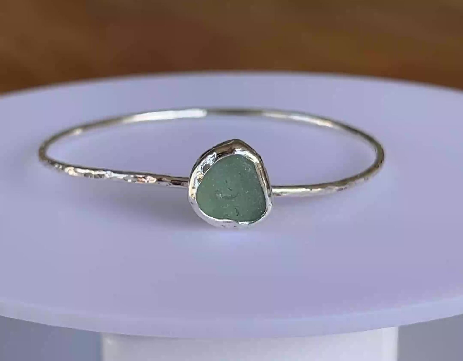 Discover the beauty of my handmade, eco-friendly recycled sterling silver bangle showcasing a captivating piece of seafood sea glass. Each bangle made has a hammered finish, adding a touch of artistry design.Crafted with love and care, the bangles are made to order. Each piece made is one of a kind being a unique piece.